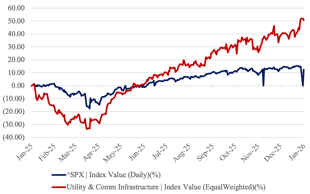 The last 12-month performance of the UCCI is up over 50 percent on the year because of the expectation for sustained growth and spending on utility and communications infrastructure. Additionally, this occurs while the stock market surpassed its all-time highs throughout the year.